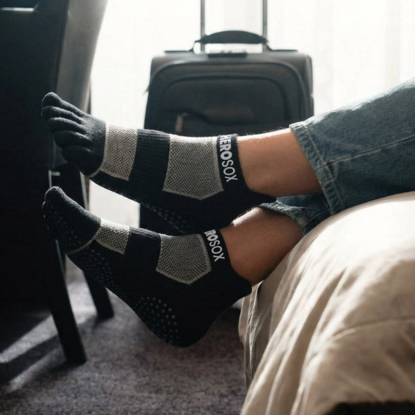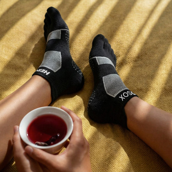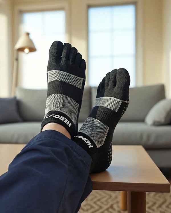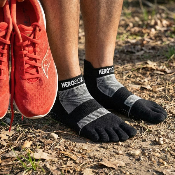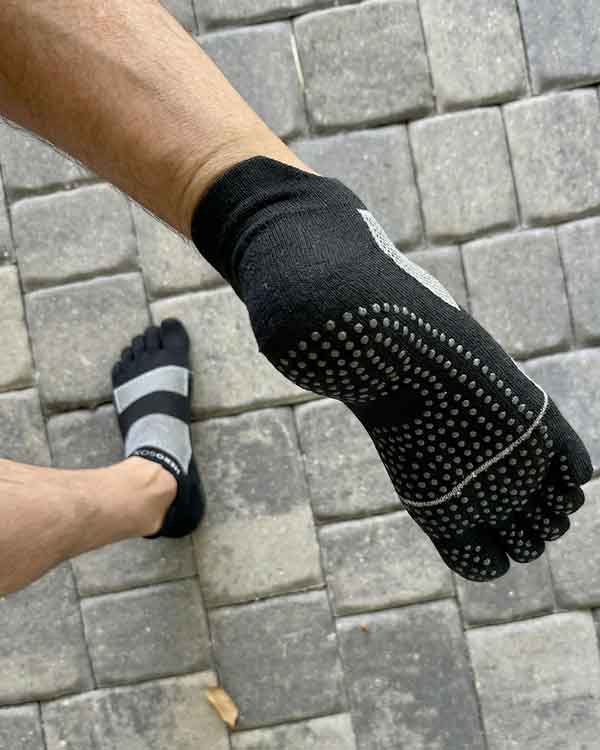 The DotGrip rubber dots keep you stable whether you're on a yoga mat or walking on hardwood floors. The five-toe design prevents blisters when you run. The moisture-wicking fabric keeps your feet comfortable whether you're working out or just walking around your house.