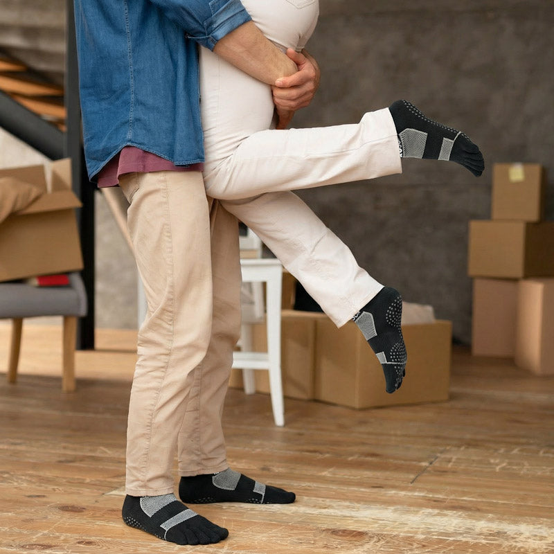 Grip socks for the bathroom. Toe socks for running. House socks for daytime. Three products. Still slipping. Still blistering.